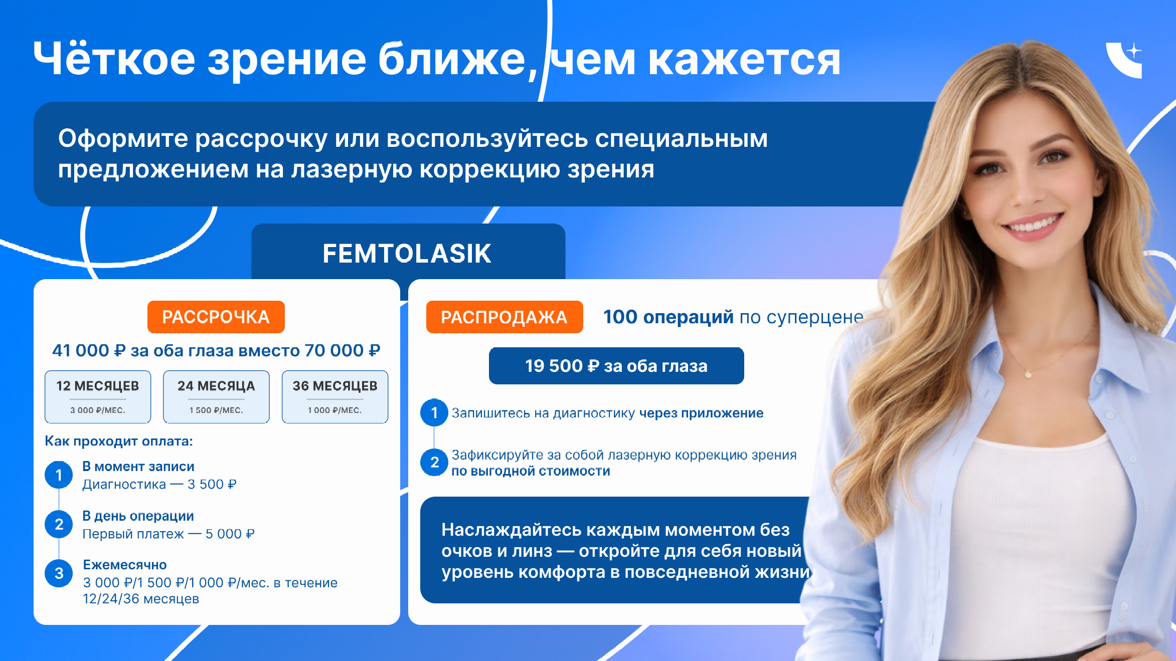 Также сейчас его можно сделать с наибольшей выгодой, 38 500 р. вместо 70 000 рублей, за оба глаза.